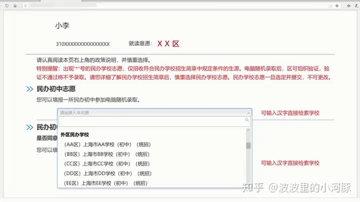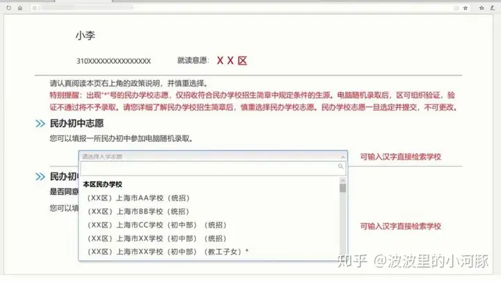 2.出现“*”号的民办学校志愿,仅招收符合民办学校招生简章中规定条件的生源。电脑随机录取后,区教委会组织验证,验证不通过的将不予录取。所以务必详细了解目标校招生简章,确定自身符合生源要求。