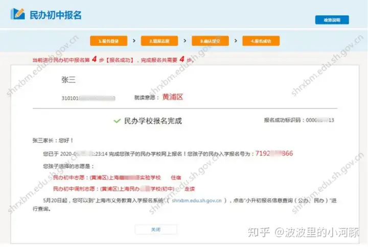 在这一步,您看到了“民办学校报名完成”字样,并且收到了确认短信,表明已经报名完成。