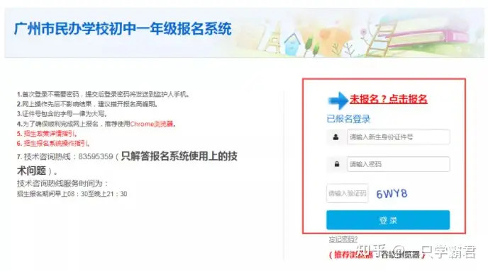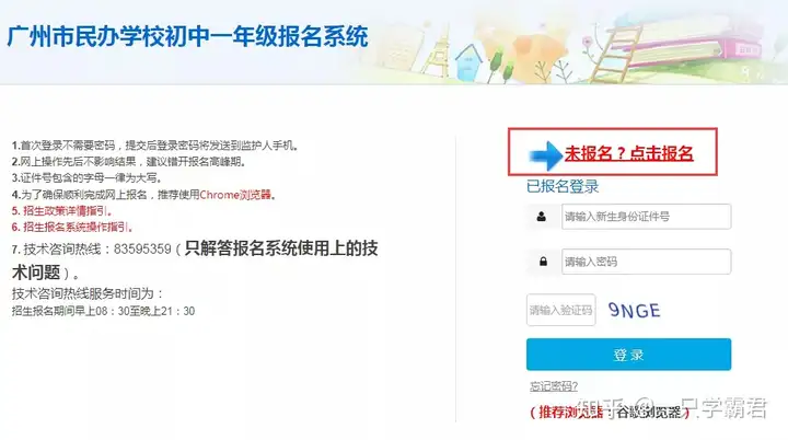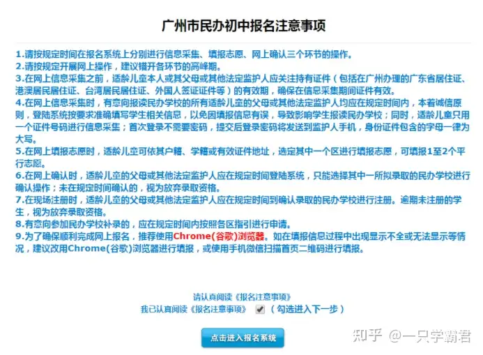 登录网址:http://zs.gzeducms.cn用谷歌浏览器 (推荐使用)登录广州市义务教育学校招生报名系统 ,并点击右侧“ 民办初中报名 ”按钮。(如图 1)