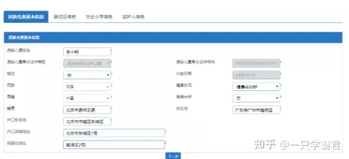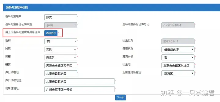 (一)【适龄儿童基本信息】:家长填写适龄儿童基本信息。(1 )按新生实际情况,填写新生姓名、民族、国籍等信息。如适龄儿童是港澳台侨,或使用护照及其他证件登记基本信息时,需要填写“现居住地”信息。确认信息无误后按“下一步”。(如图8)