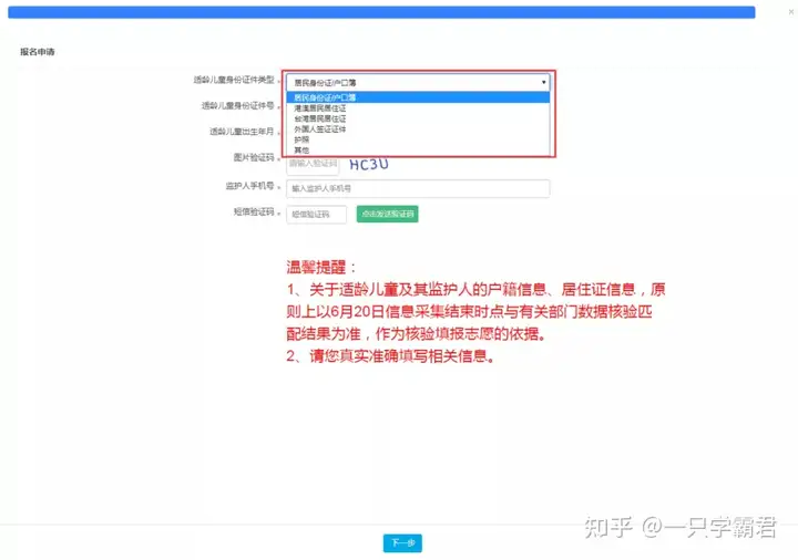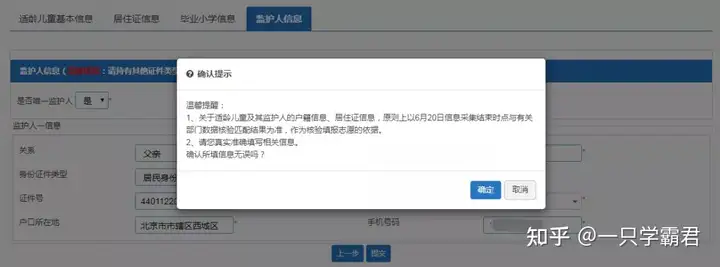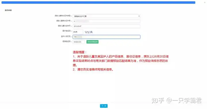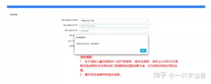 注意:1. 关于适龄儿童及其监护人的户籍信息、居住证信息、原则上以 5月31日信息采集结束时点与有关部门数据核验匹配结果为准,作为核验填报志愿的依据。2. 请家长真实准确填写相关信息。