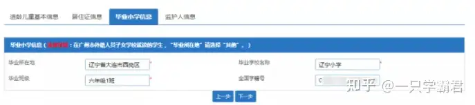 (三)【毕业小学】:填写新生小学毕业所在地及学校名称等信息。如新生小学毕业所在地为广州市,则无需手动输入毕业小学信息,系统将会自动匹配毕业小学信息。非广州毕业生或因个别原因不能自动匹配,则手工填写毕业小学信息。(注意:在广州市外籍人员子女学校就读的学生,“毕业所在地”请选择“其他”。) (如图 14)资料填写完毕后确认无误可进行下一步操作。