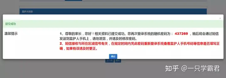 (五)【完成信息填报】请家长确认所填信息是否无误,如确认信息无误请 按“提交”。提交成功后系统即向监护人手机发送随机密码的短信。家长可凭此短信密码重新登录系统查看资料及完成其他相关操作。(如图 17、图 18)