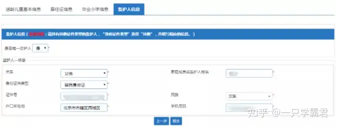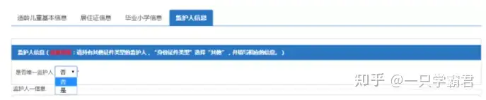 操作步骤:(1 )选择监护人是否唯一监护人。(2 )如只有一个监护人,只需要填写监护人一信息即可。如果不是,继续填写监护人二的相关信息,操作方法同监护人一。(3 )确认无误请按“提交”。