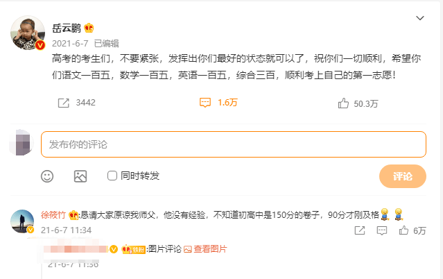 之后,岳云鹏也将内容进行了更改,说希望大家都能考到150,综合考到300,顺利考上自己的第一志愿,虽然岳云鹏一开始发错了,但并没有被广大网友嘲笑,毕竟很多人都知道,岳云鹏的学历不高,确实没有经历过中考和高考,说错肯定不是故意的,关键是徒弟给他化解的也非常好,不至于让岳云鹏感到尴尬。