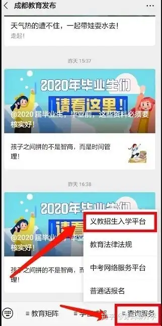 点击菜单栏“查询服务”,进入“成都市义务教育招生入学服务平台”。