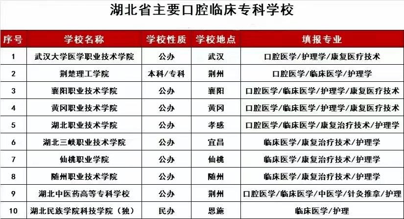 湖北是教育大省,全省有127所高校,开设口腔医学专业的专科院校有七所,都是湖北省的公办院校,考上后学费低,毕业后可以在全国范围内报考执业医师。外省学生享受湖北教育大省的低分录取政策,更多关于医学专业的资讯关注-公众号:助力医学课堂返回搜狐,查看更多