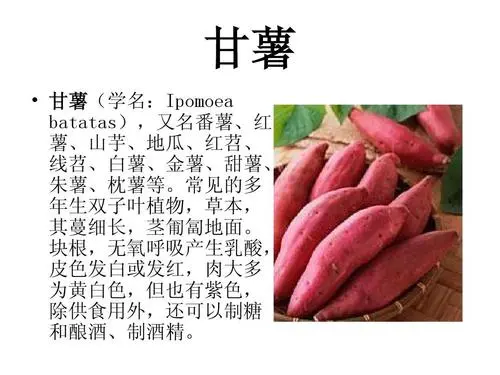 甘薯能中和体内因过多食用肉食和蛋类所产生过多的酸,保持人体酸碱平衡。能吸收胃肠中较多的水分,润滑消化道,起通便作用,并可将肠道内过多的脂肪、糖、毒素排出体外,起到降脂作用。