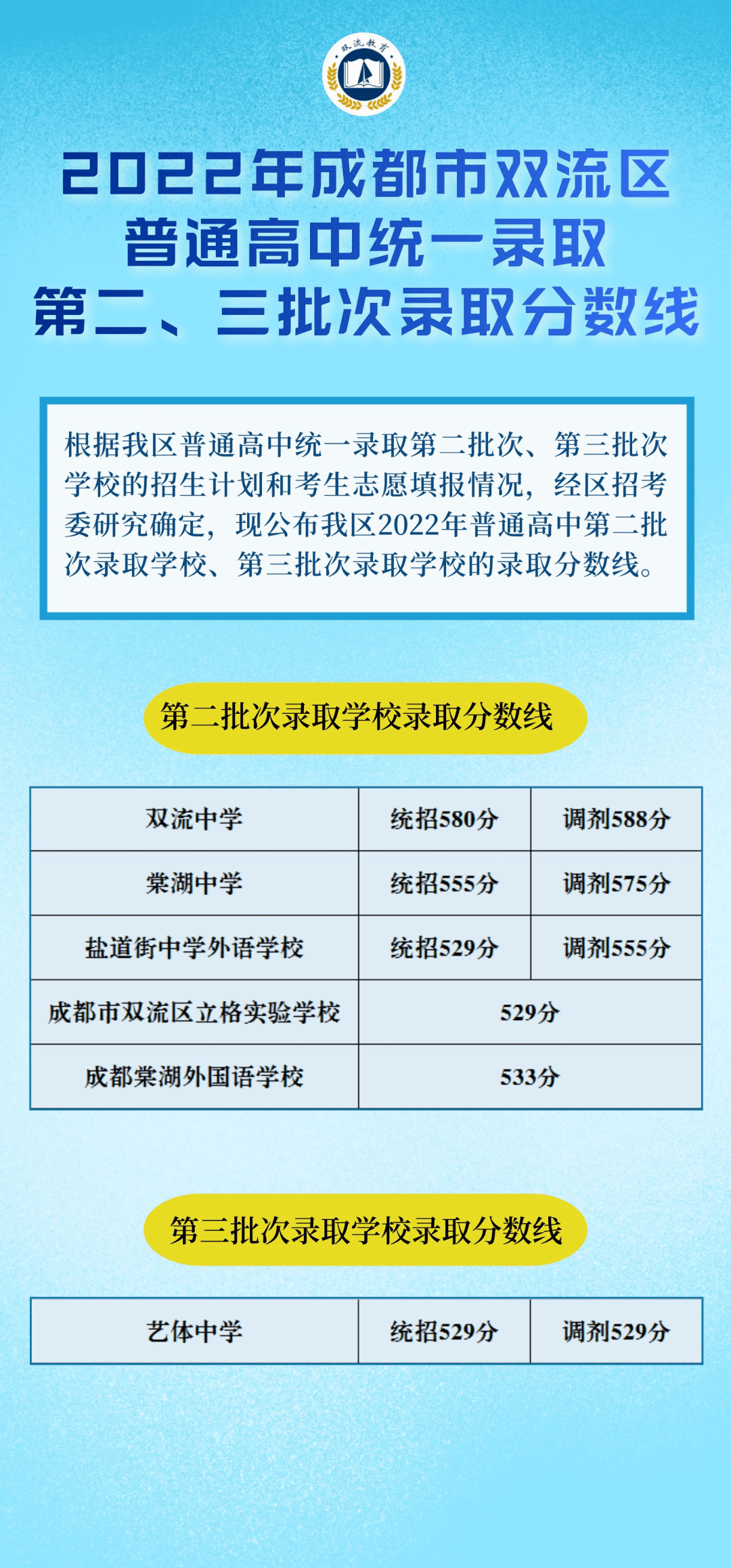 2022年成都市双流区普通高中统一录取第二、三批次录取分数线
