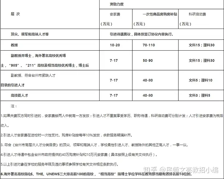 聘用人员除按国家有关规定享受工资、保险等待遇外,符合《台州职业技术学院高层次人才引进工作实施办法(修订稿)》(台职院党〔2019〕52号)高层次人才标准的提供购房补贴、安家费、科研启动费等方面的待遇。具体见下表: