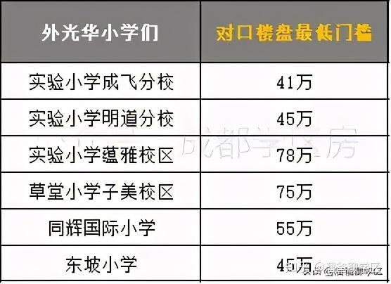 外光华小学们的学区房最低门槛排序:实小蕴雅校区>草堂子美校区>同辉国际小学>实小明道分校=东坡小学>实小成飞分校。