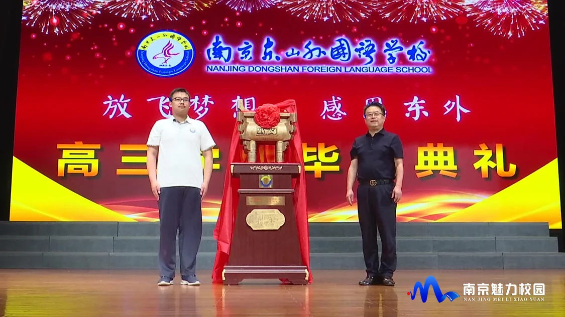 毕业典礼共分为五个篇章,第一篇章大家一同观看了各班级制作的暖场视频,回忆了三年来在东外度过的点点滴滴。随后,全体起立,高唱校歌。第二篇章正式开始,学生代表上台发言,代表全体毕业生送上对母校和老师们的祝福。第三篇章难忘师恩中,家长代表对老师们上千个日夜的辛勤付出表达了由衷的感谢,也期望同学们能够铭记老师的教诲,开启新的旅程。第四篇章是“再见母校”,大屏幕上播放了视频《我心中的东外》,视频中,同学们用真挚的话语表达着对母校的热爱和不舍。接着,南京东山外国语学校副校长韩海燕上台致辞,为同学们送上毕业祝福。校长周飞虎为同学们颁发了毕业证书,叮嘱毕业生们要常回学校看看。随后,毕业生代表为学校赠送纪念礼物一一红古铜鼎,代表全体高三毕业生祝愿母校蒸蒸日上,再创辉煌。