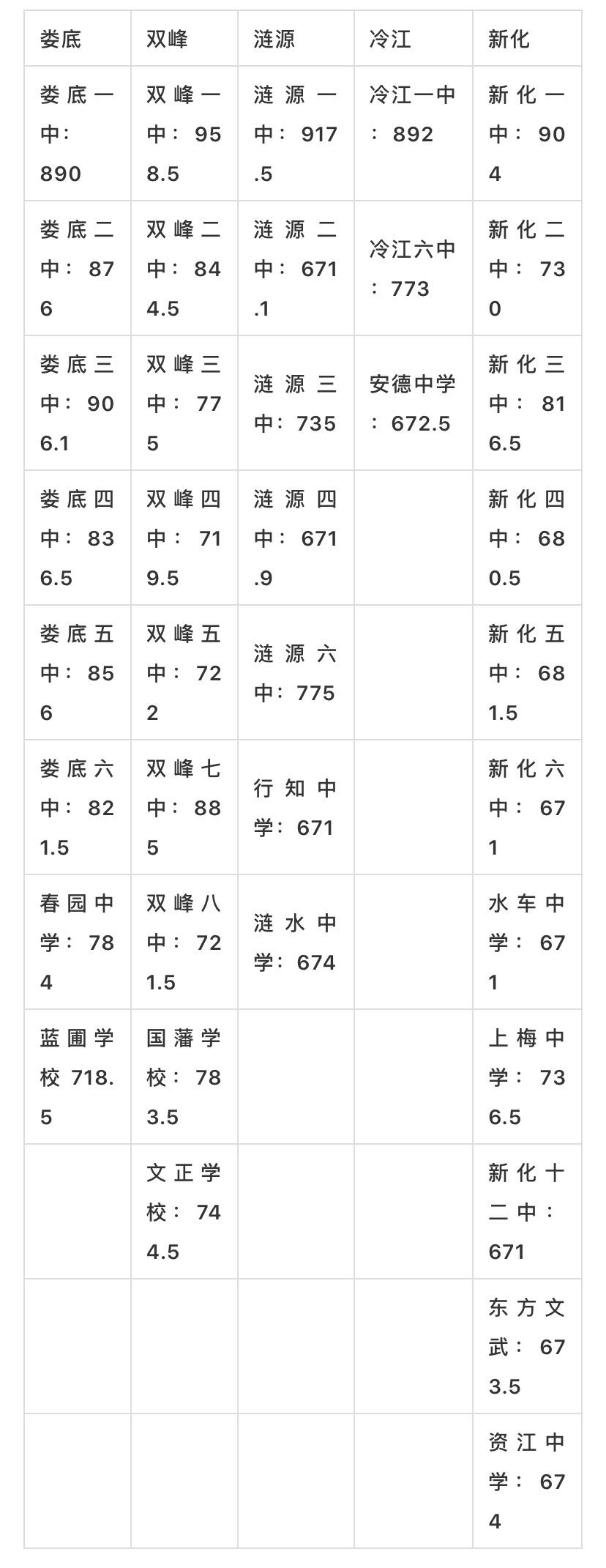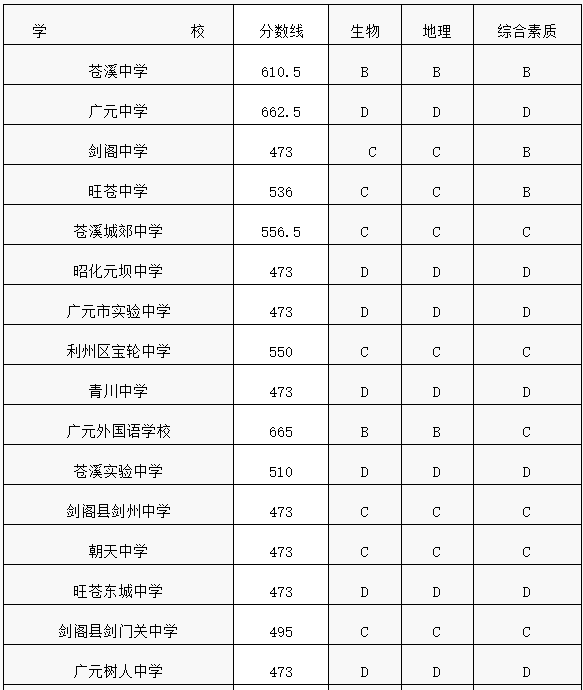 江油市太白中学:603分,绵阳市开元中学:552分,高新区实验中学:565分,绵阳市丰谷中学:550分,绵阳市秀水中学:565分。二、全市普通高中最低录取分数控制线为550分。