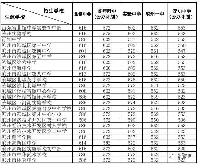 六、滨州市城区五所普通高中(公办计划,含指标生)最低录取分数线如下表: