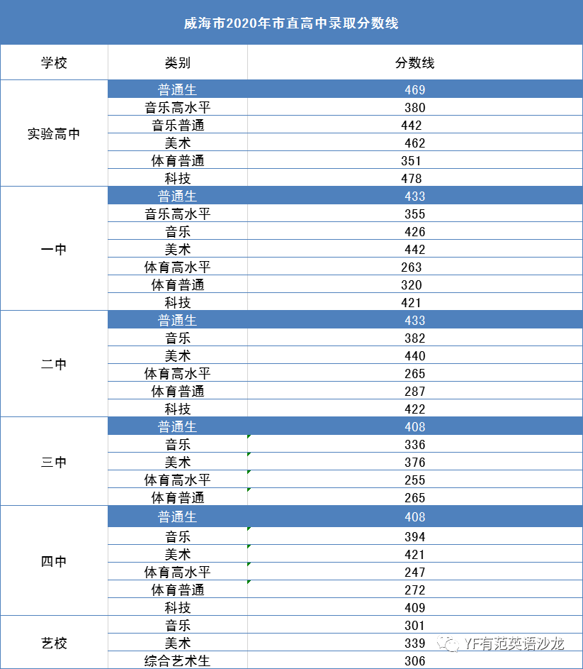 市直普通高中学校常规生(不含直升生、指标生、自主招生)录取最低分数如下: