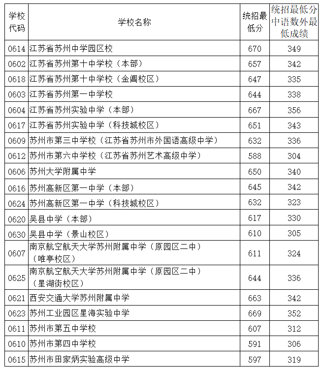 2020年苏州市区高中段招生第一批次统招录取各校最低分公布如下: