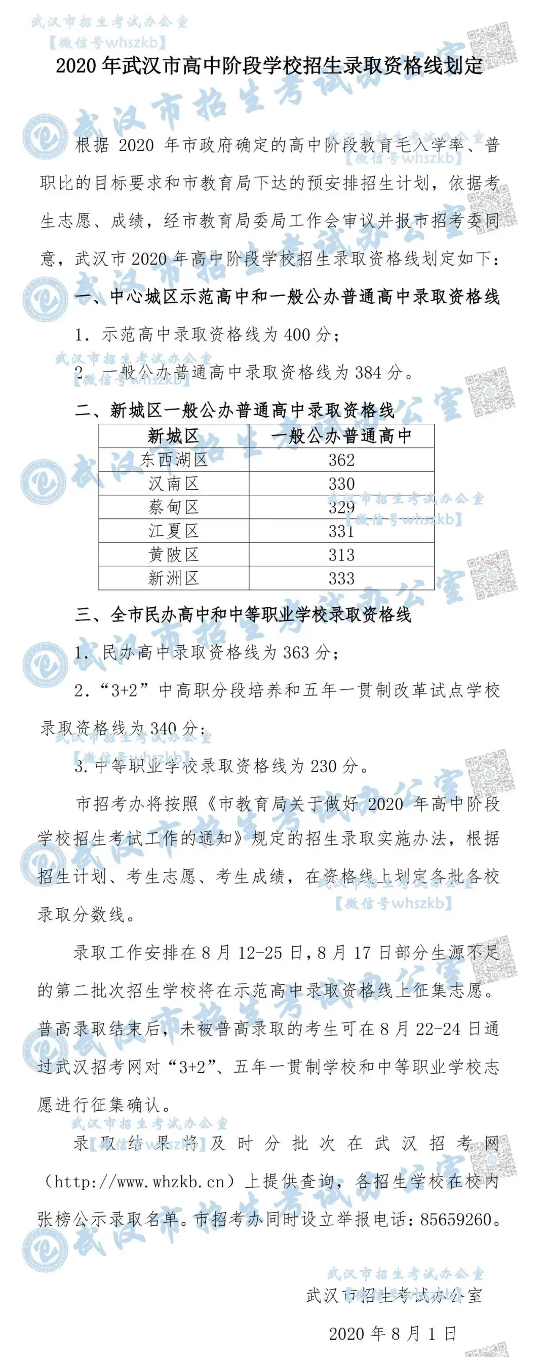 武汉市招考办权威发布高中录取资格线:示范高中400分,普高384分。