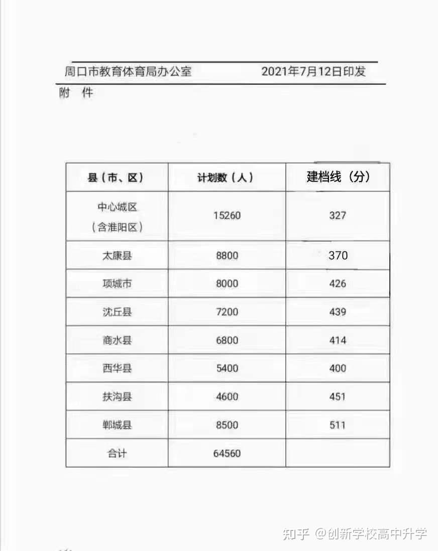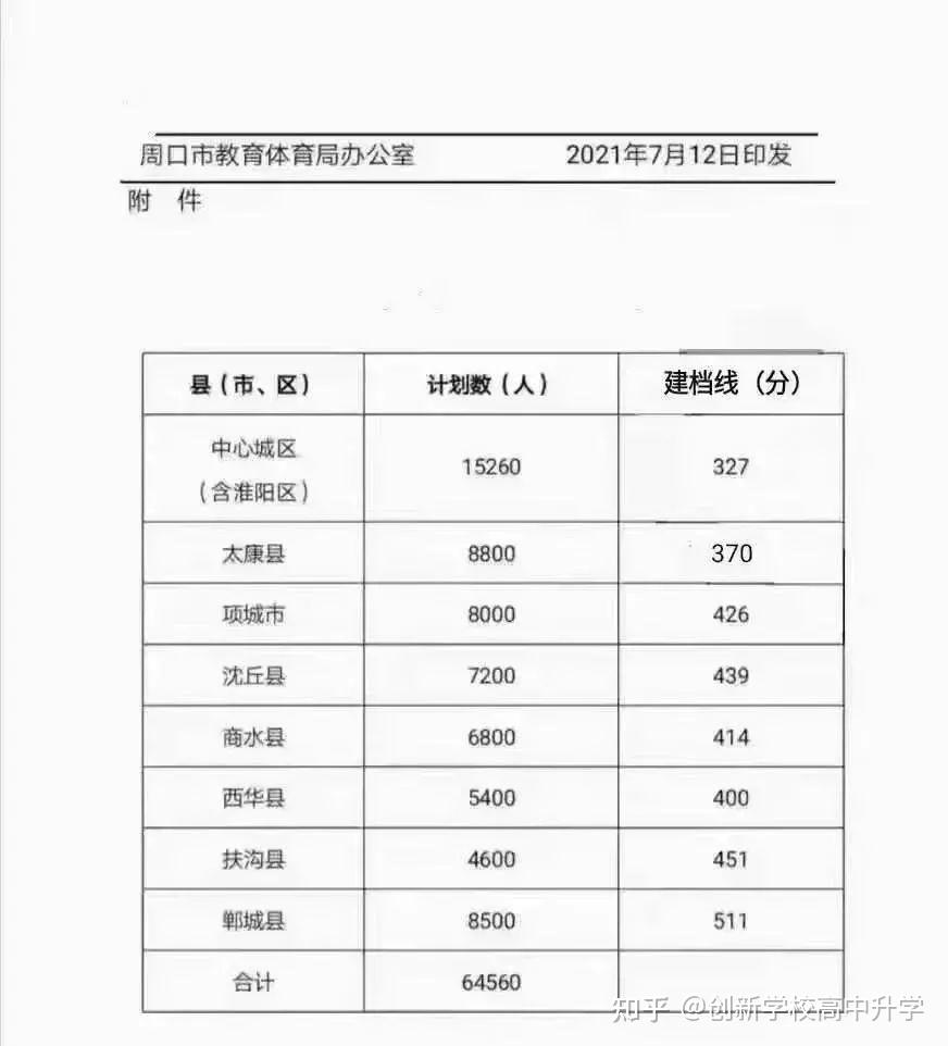 根据《周口市教育体育局关于做好2021年普通高中招生工作的通知》(周教基〔2021〕33号)要求,经研究,按照招生计划确定各县(市、区)普通高中招生最低建档线,现予以公布。